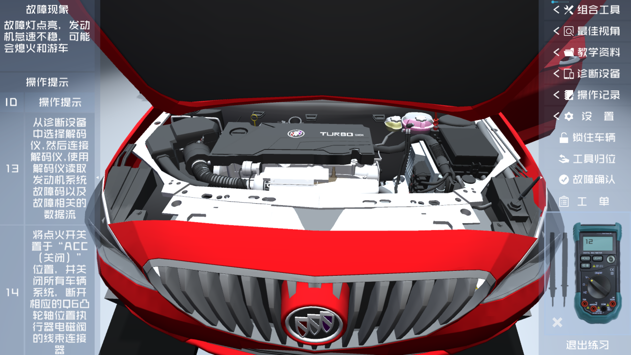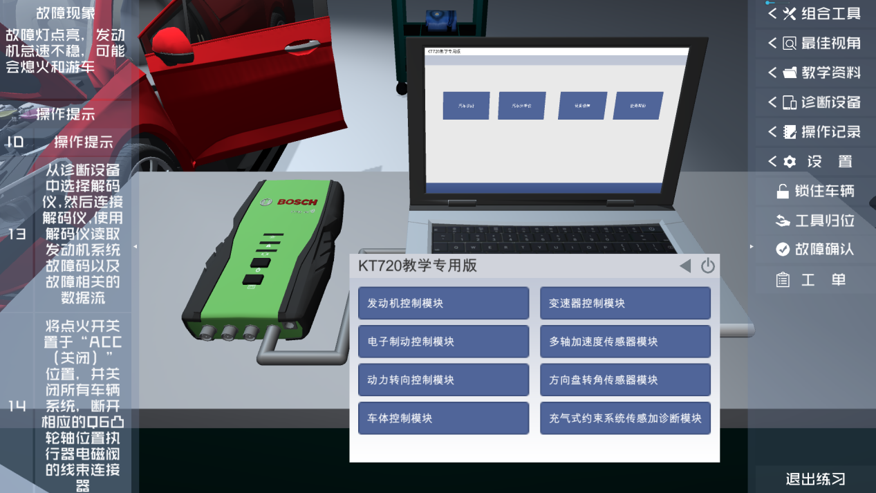软件搭建了一个高度真实的仿真实训环境,用户可在软件内对汽车进行一系列模拟实训操作。